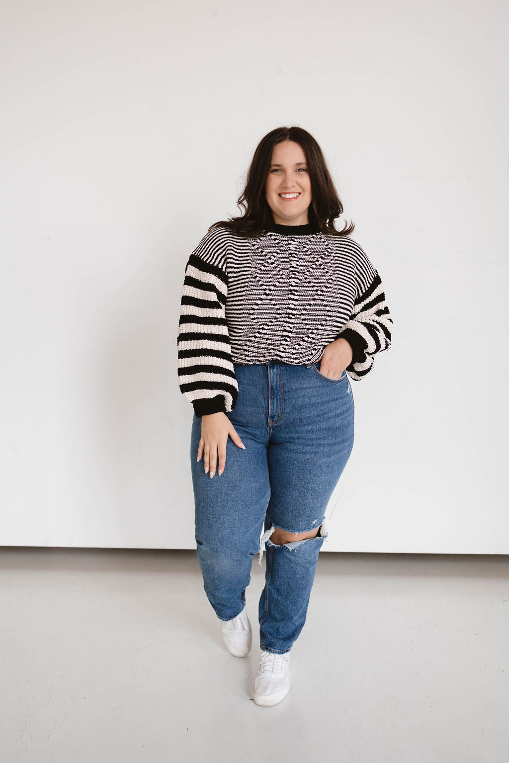 Say hello to your new favorite sweater! This super soft, chunky knit sweater features a super fun design and striped pattern throughout. The balloon sleeves give it the perfect finishing touch!