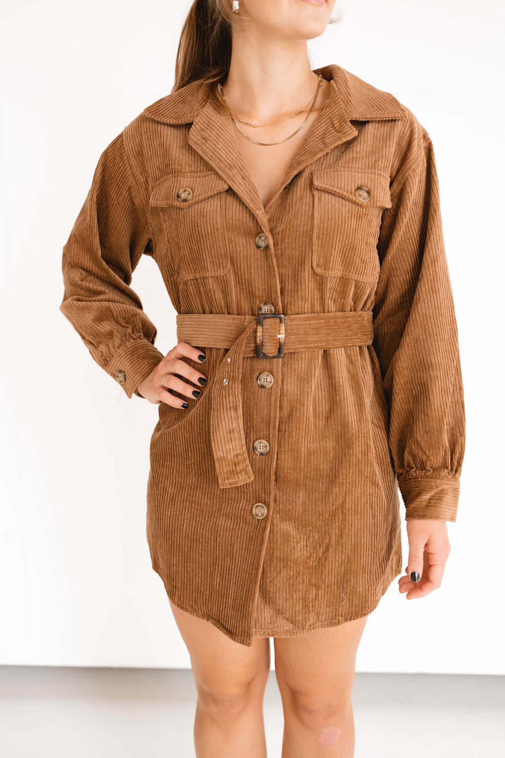 The Cinnamon Spice Dress is the definition of the perfect fall dress! This corduroy, button-down shirt dress features a ribbed design with a looped belt on the waistline. The rust color and warm material will give you all the fall vibes.