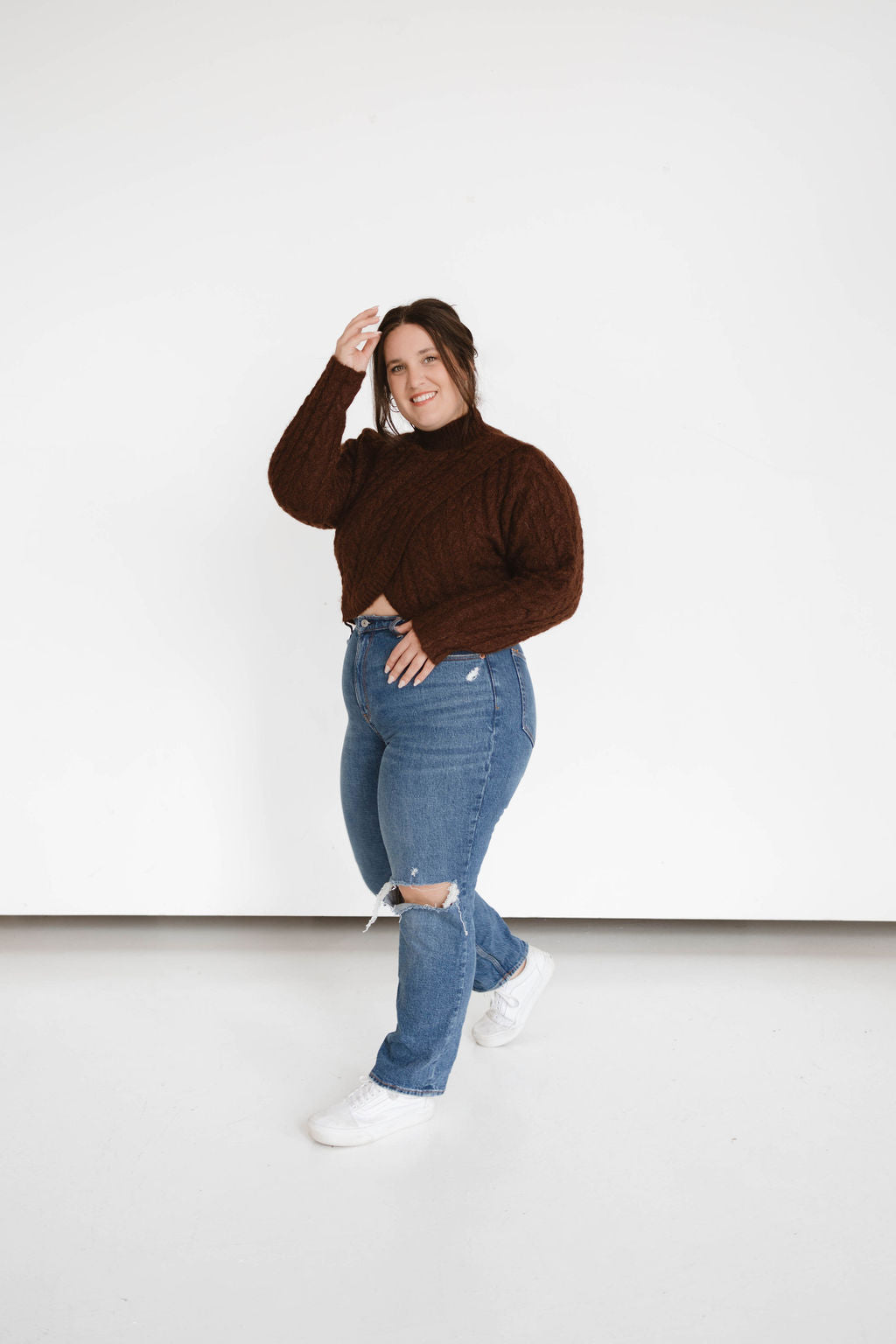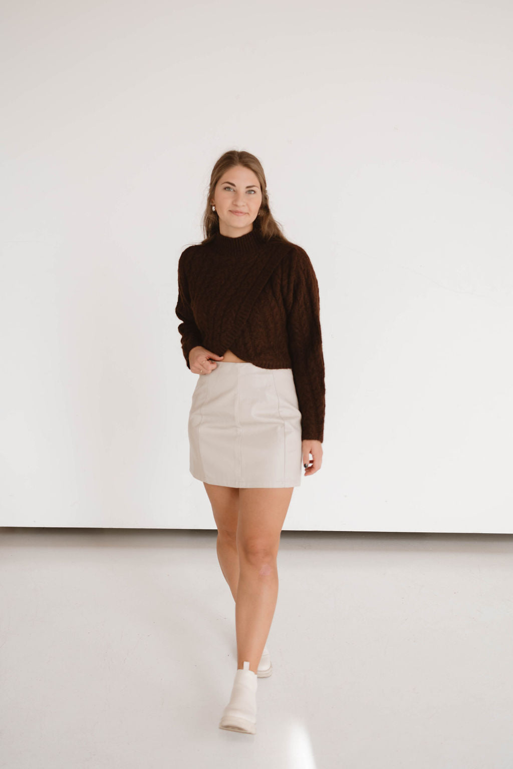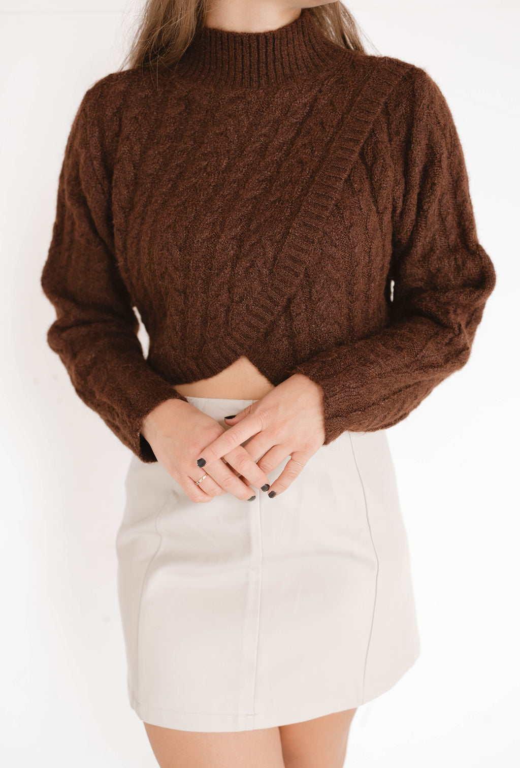 Meet our Cocoa Sweater! This adorable, fold-over sweater features a cable knit design, high neck style and a cropped fit. It pairs perfectly with skirts or jeans for a more dressed up look for any occasion.