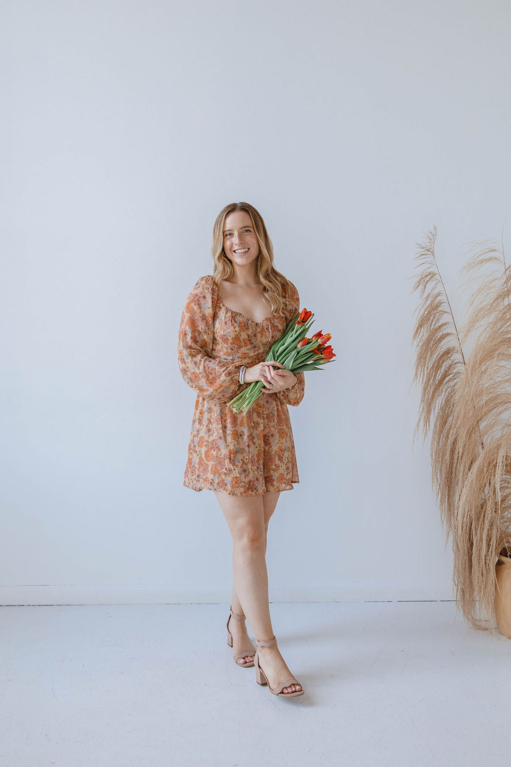 Our Fallin’ for You Dress is exactly what you need for your Fall wardrobe. This flirty piece features a sweetheart neckline, autumn, floral print and long-sleeves.
