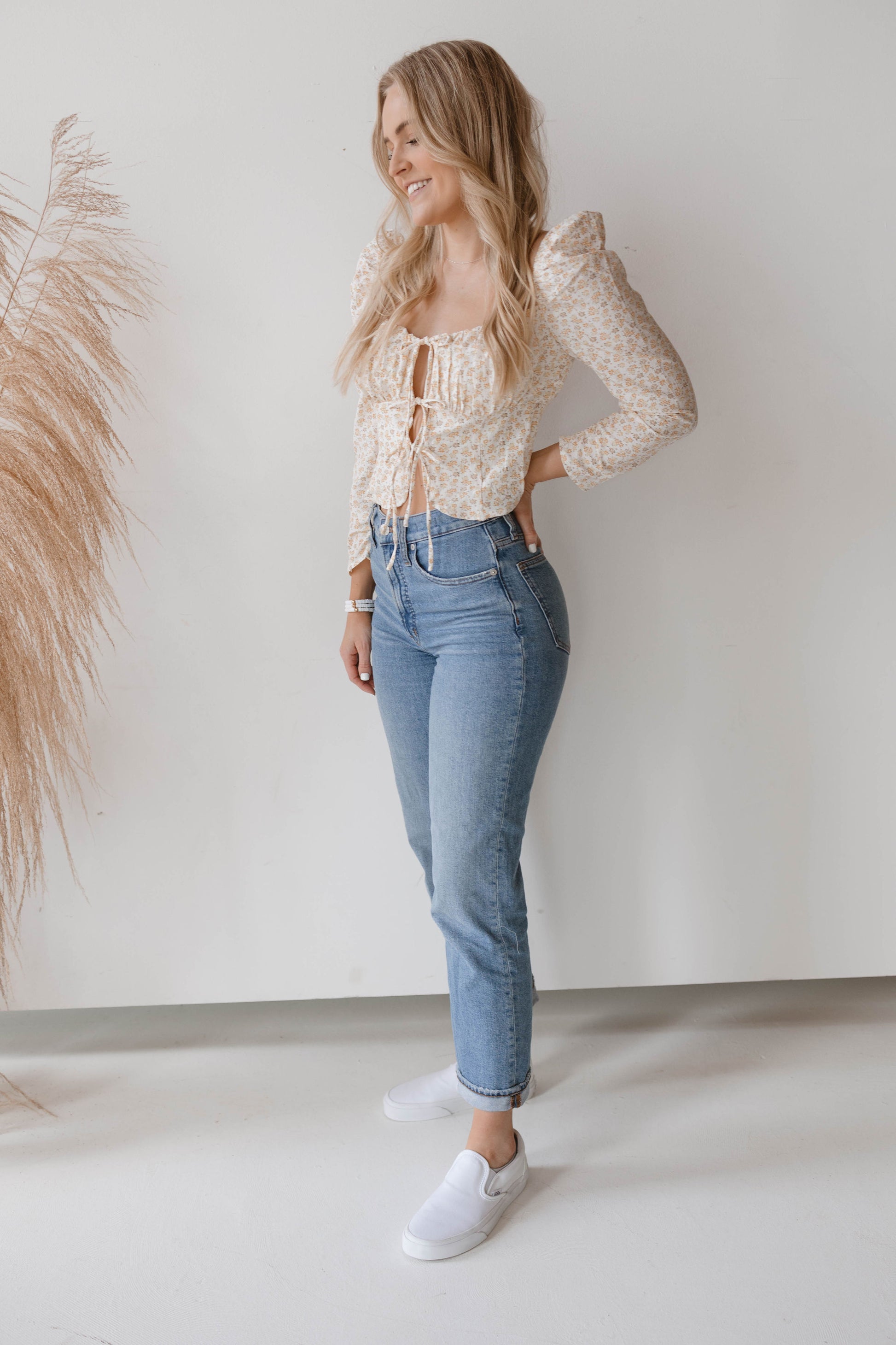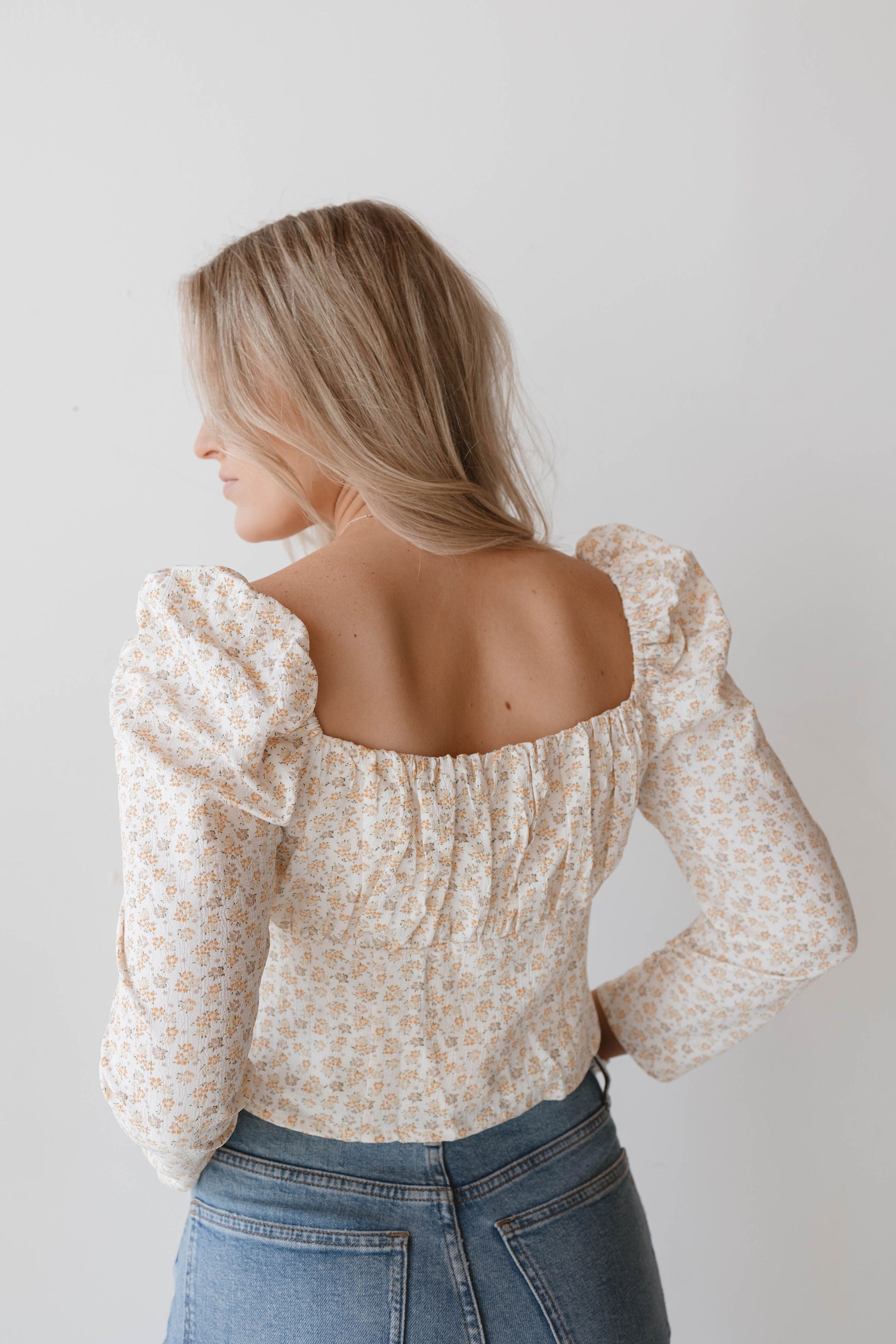 This sweet, long sleeve blouse is an adorable addition to any closet! Featuring 3 front bow ties, puff sleeves and a floral patterned design. The light yellow and white color brightens any outfit for spring!