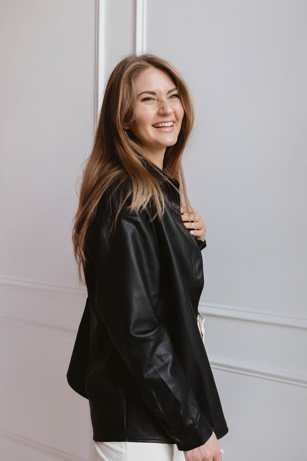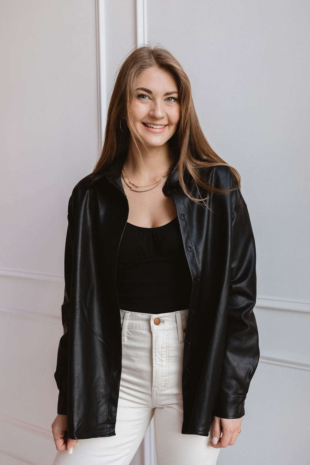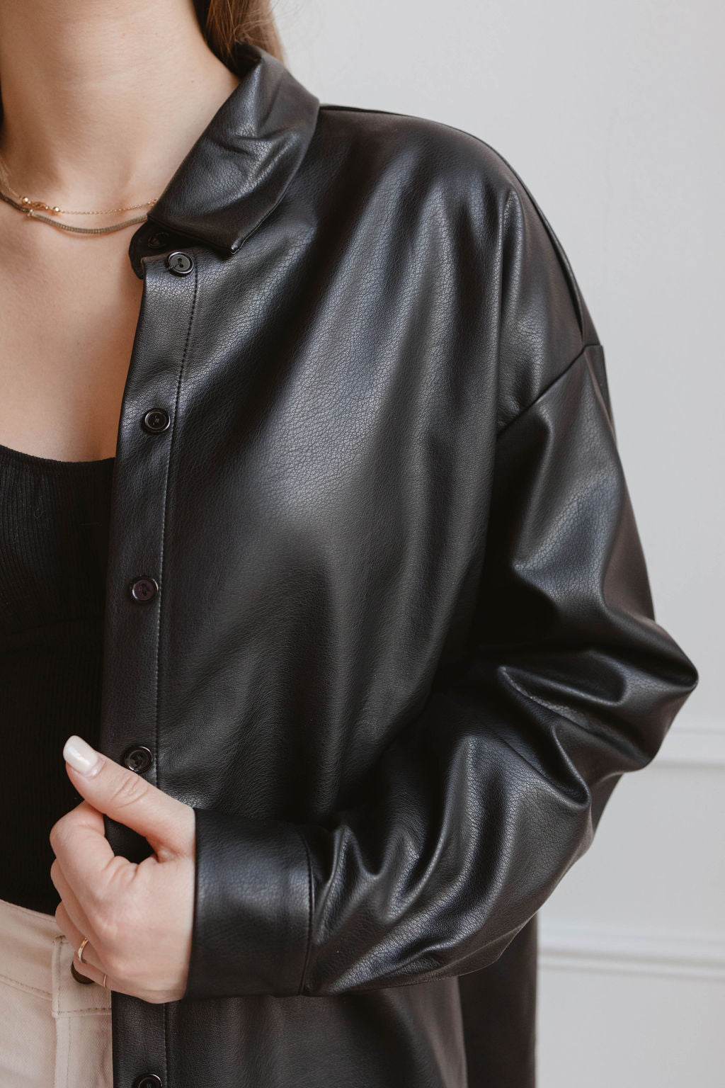 Meet the Kiss & Tell Leather Shacket! Your favorite shacket just got upgraded. This chic, leather top elevates any outfit to have you feeling AND looking amazing all night long! Pair with jeans over a simple bodysuit or form-fitting top for your favorite look taken to the next level!