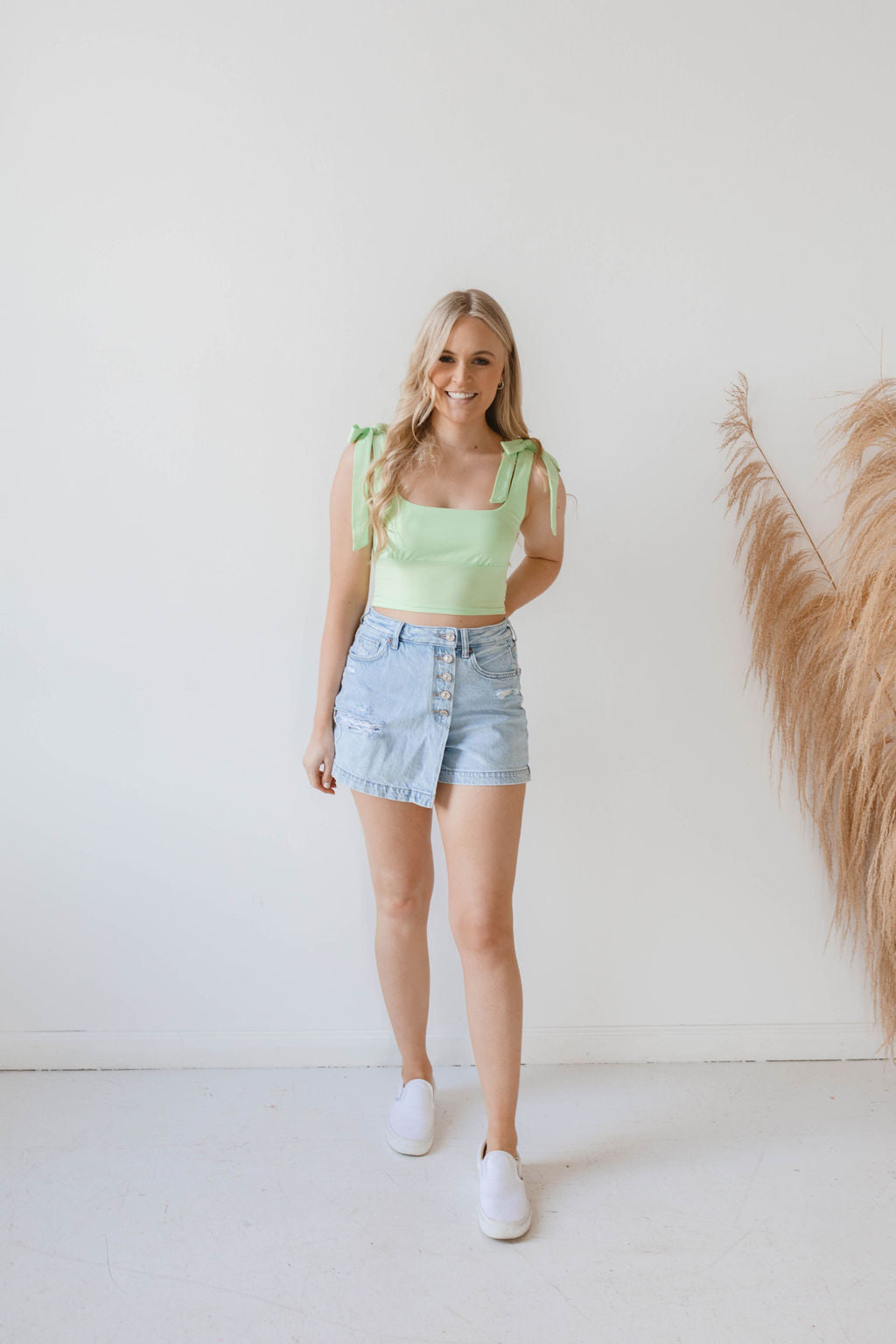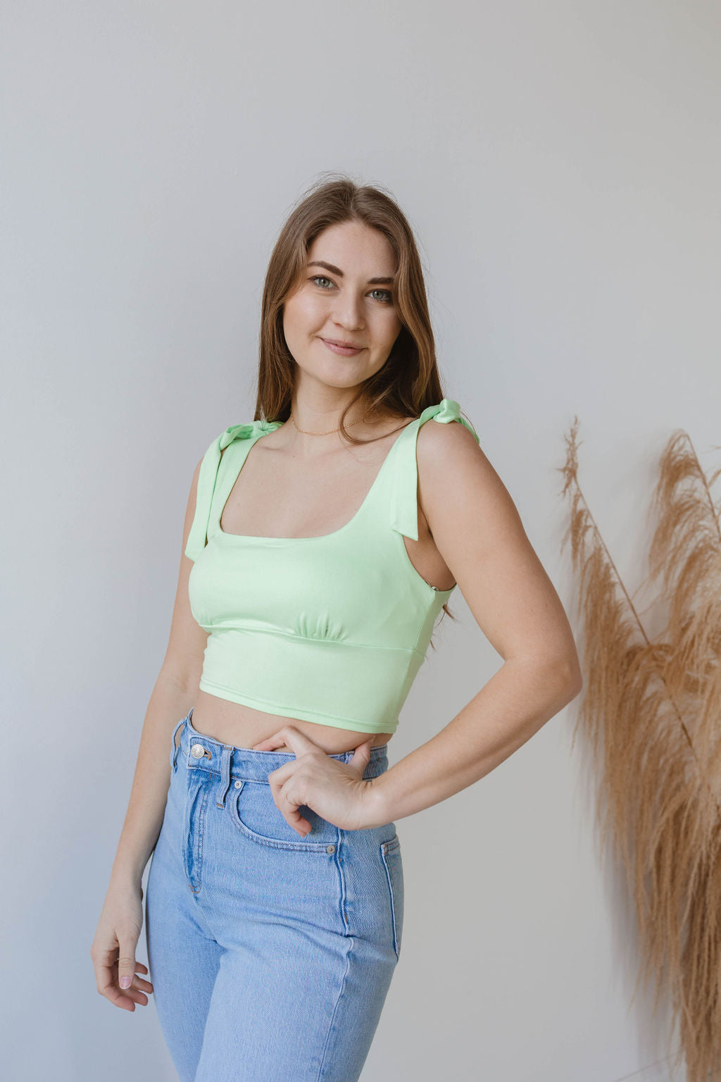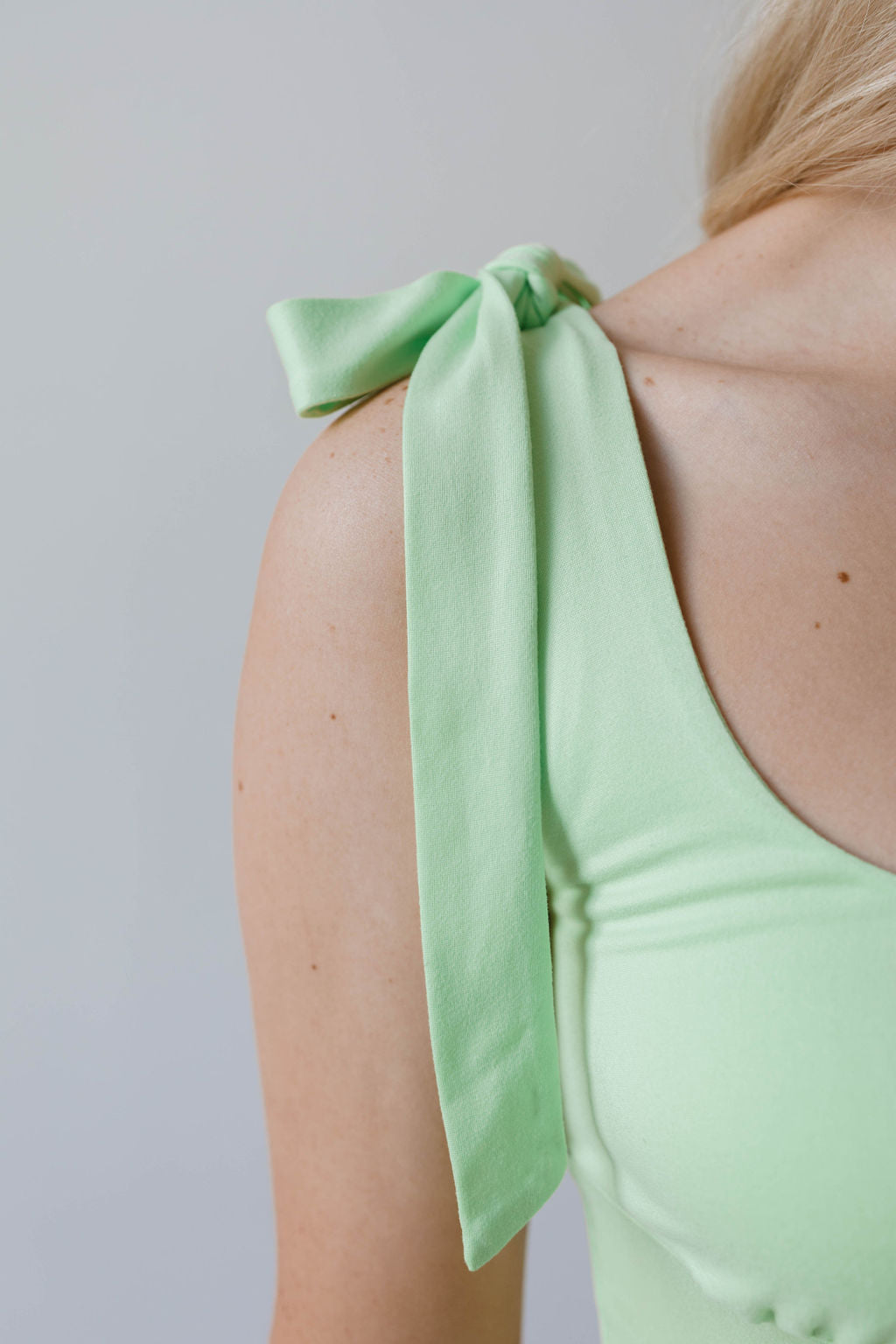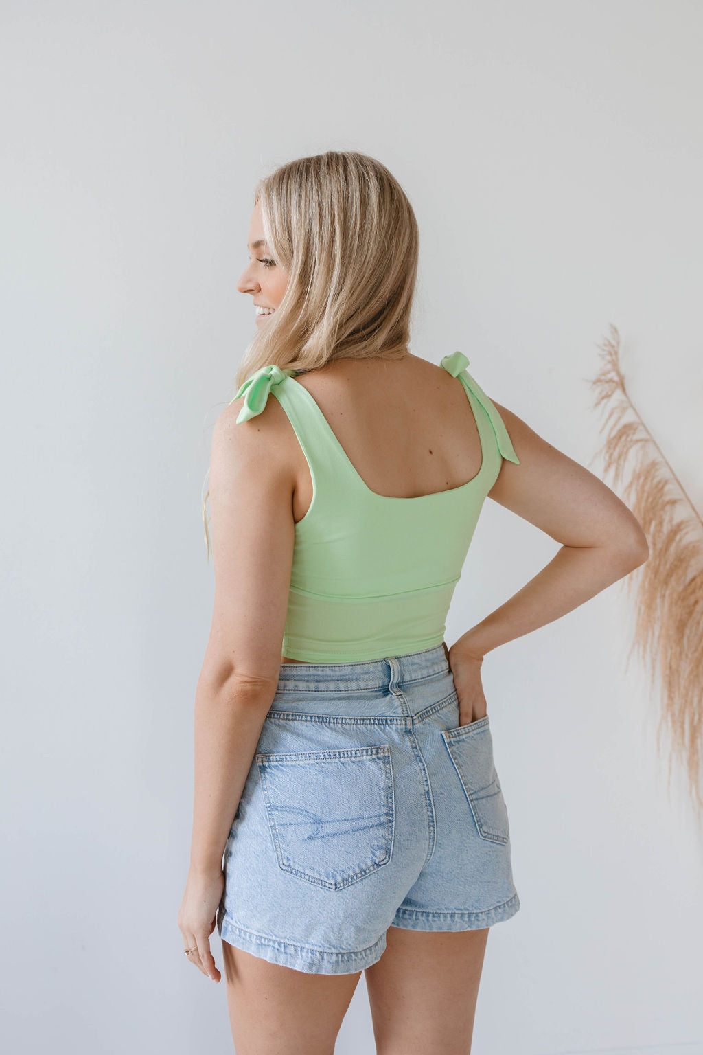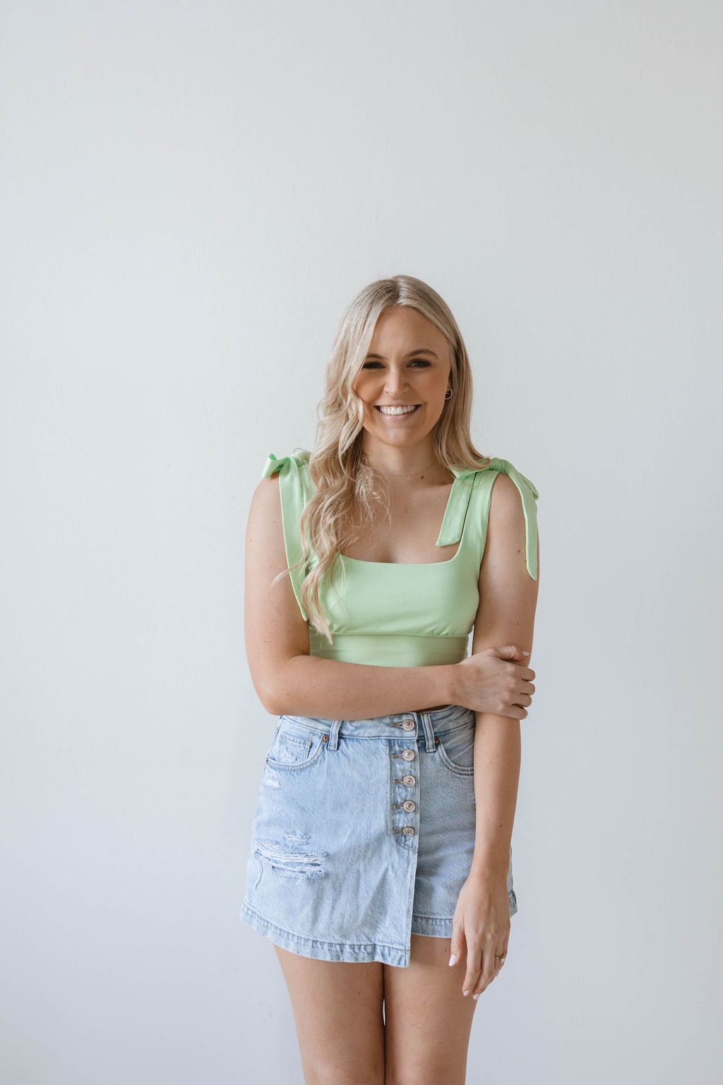 PSA: Lime green is in for summer! This tie strap, crop top is the ultimate essential for any summer wardrobe. Featuring the cutest scoop neck, this top will elevate any summer outfit! Pair with your favorite linen trousers for a night out with your friends, or your best denim shorts to walk the beach!