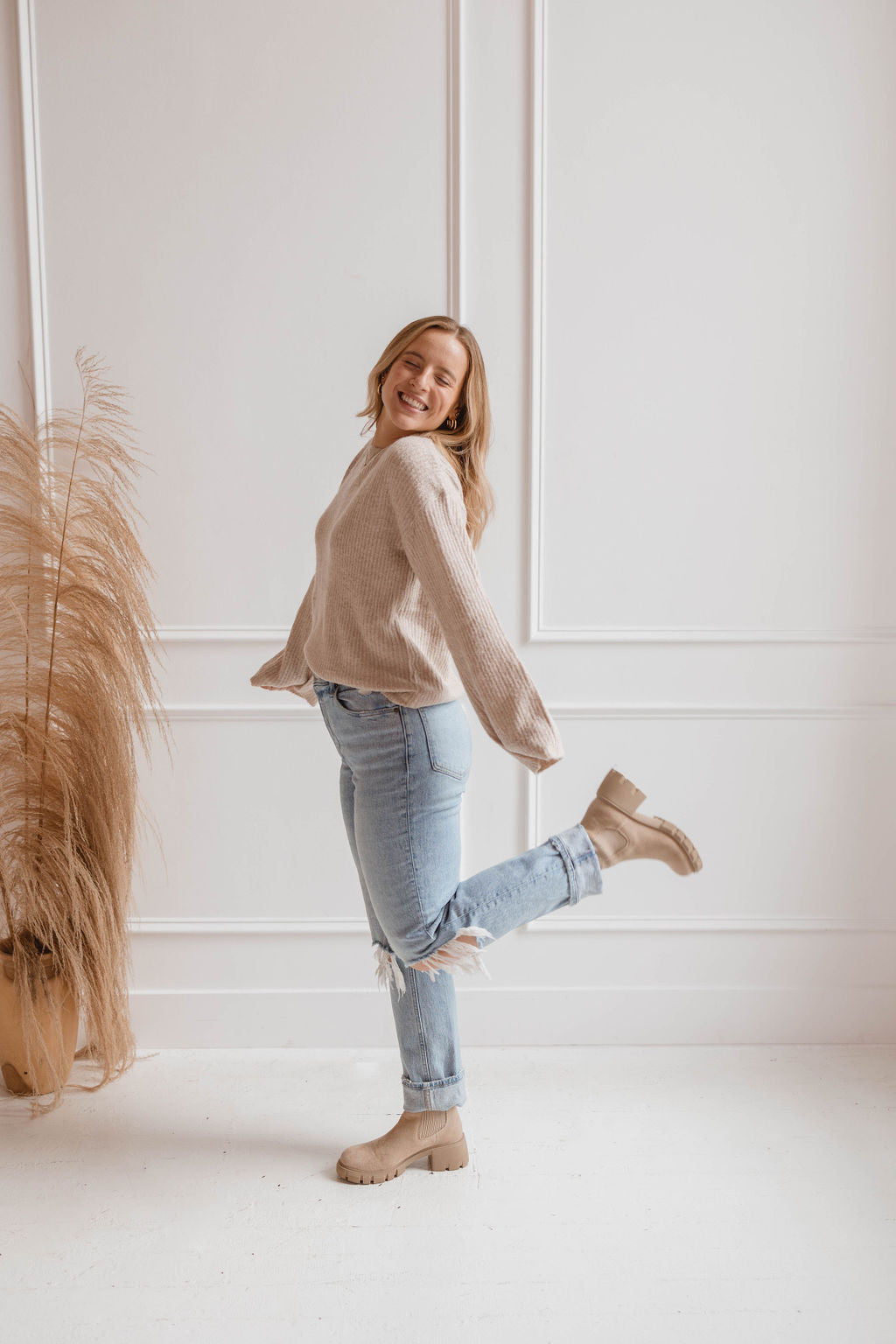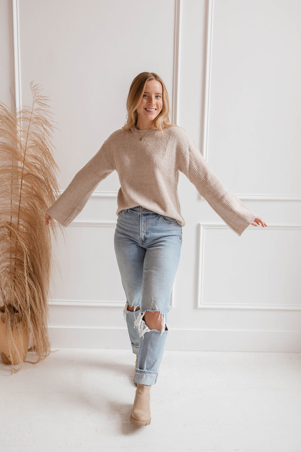 Trend alert: tan sweaters are in! The Lydia Sweater is one of our comfiest sweaters yet! This sweater features the cutest and most unique slit down the left side of the sweater. Pair with your favorite jeans and ugg minis for the cutest and trendiest fit!