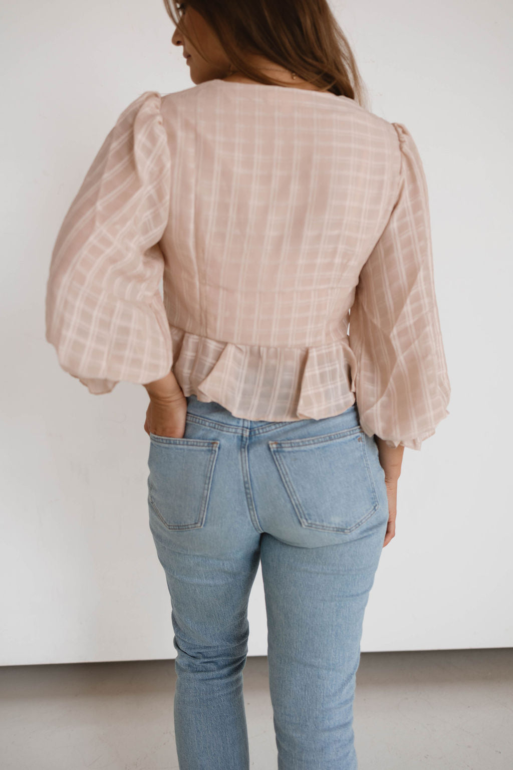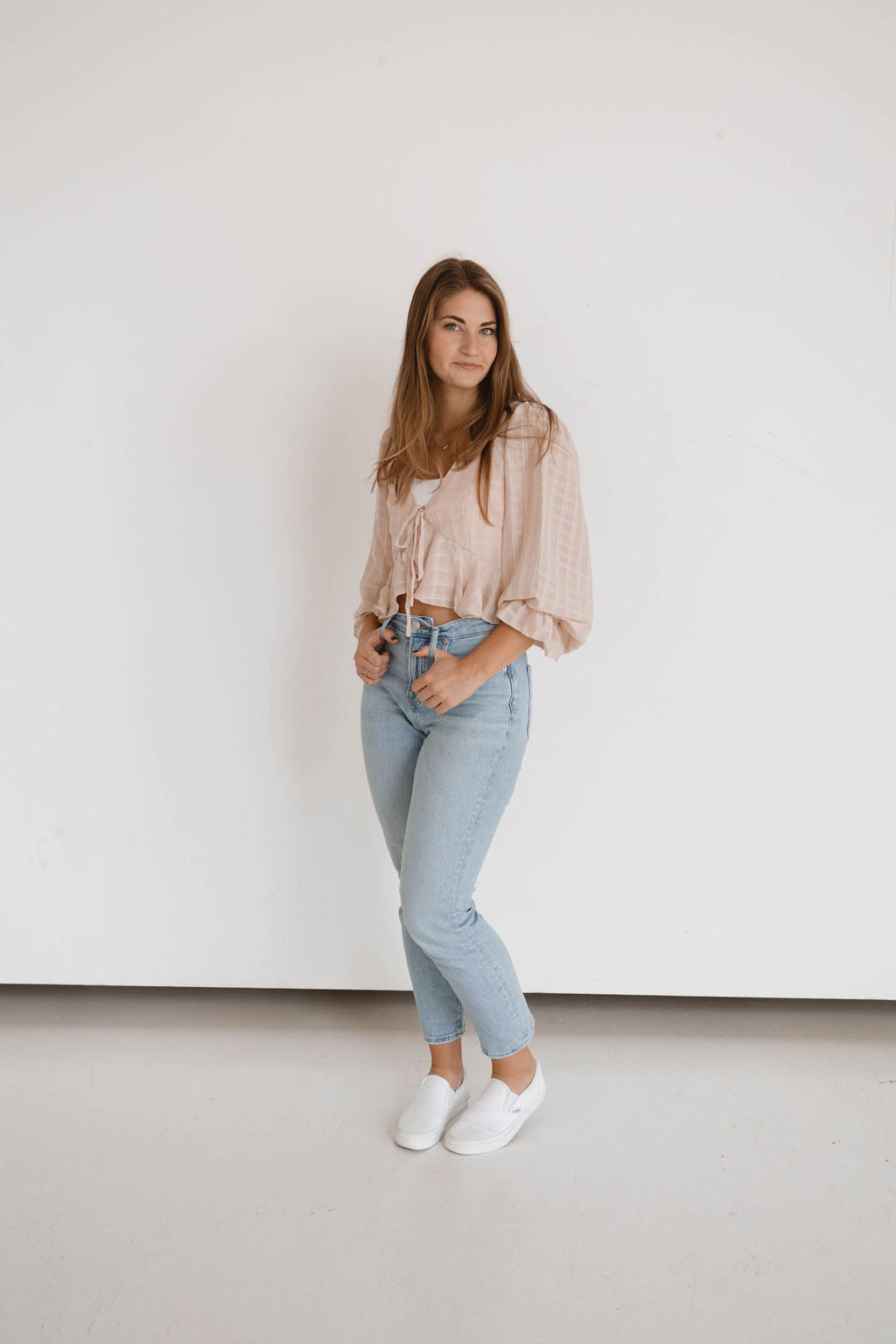 Meet the Penelope Blouse! This girly, light pink blouse features a v-neckline, flowy sleeves, and a tie front design that gives you an effortless/flirty look. Perfect for a date night or day out with the girls. Pair with jeans and a bralette and you'll be getting compliments all night long!
