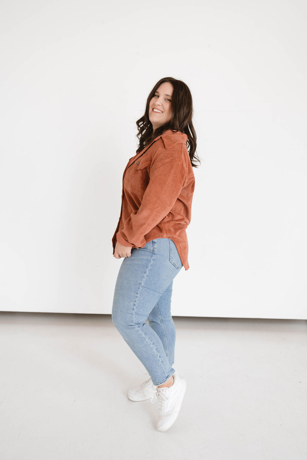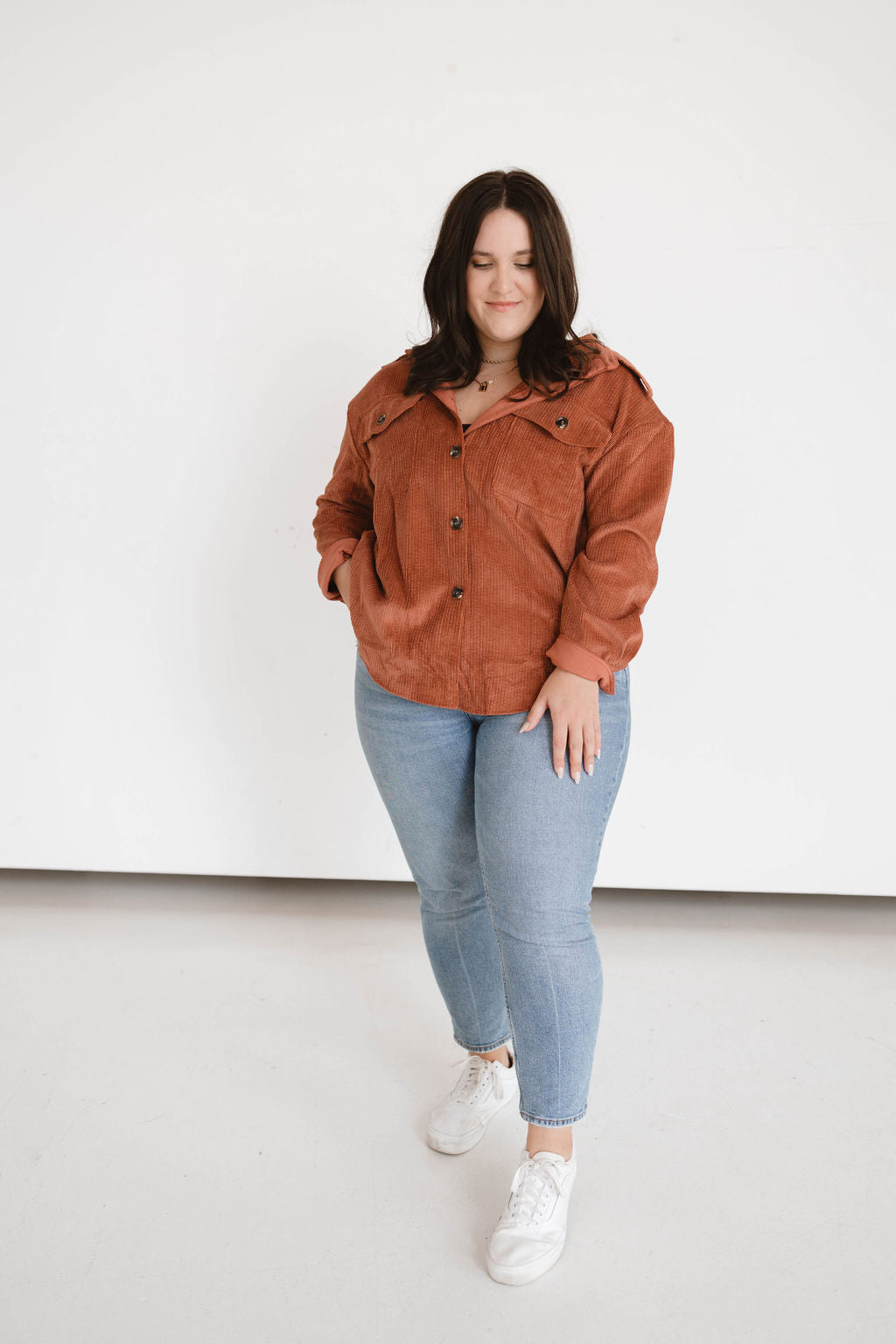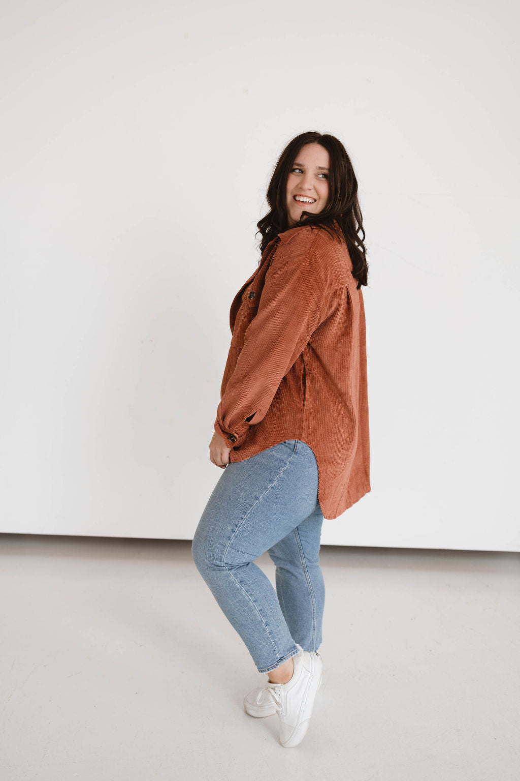 The coziest corduroy shacket you will ever own! This rust colored shacket adds a pop of fun to any outfit this winter season. The super soft material and oversized fit will keep you warm all winter long. Pair with leggings and sneakers for a casual look or with black jeans and a bodysuit for a stylish nighttime outfit! *Runs true to size - we would not recommend sizing up due to the oversized fit*