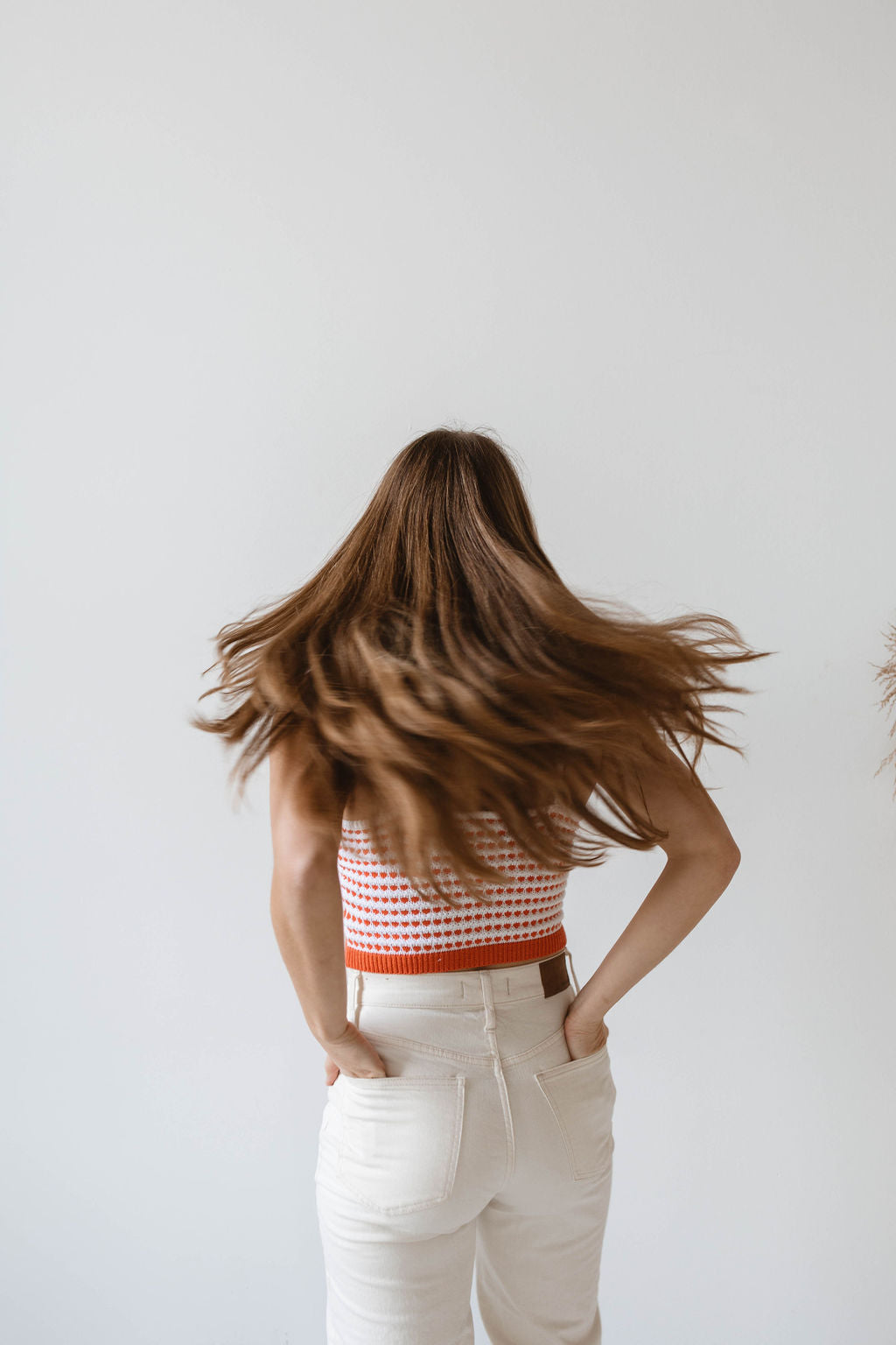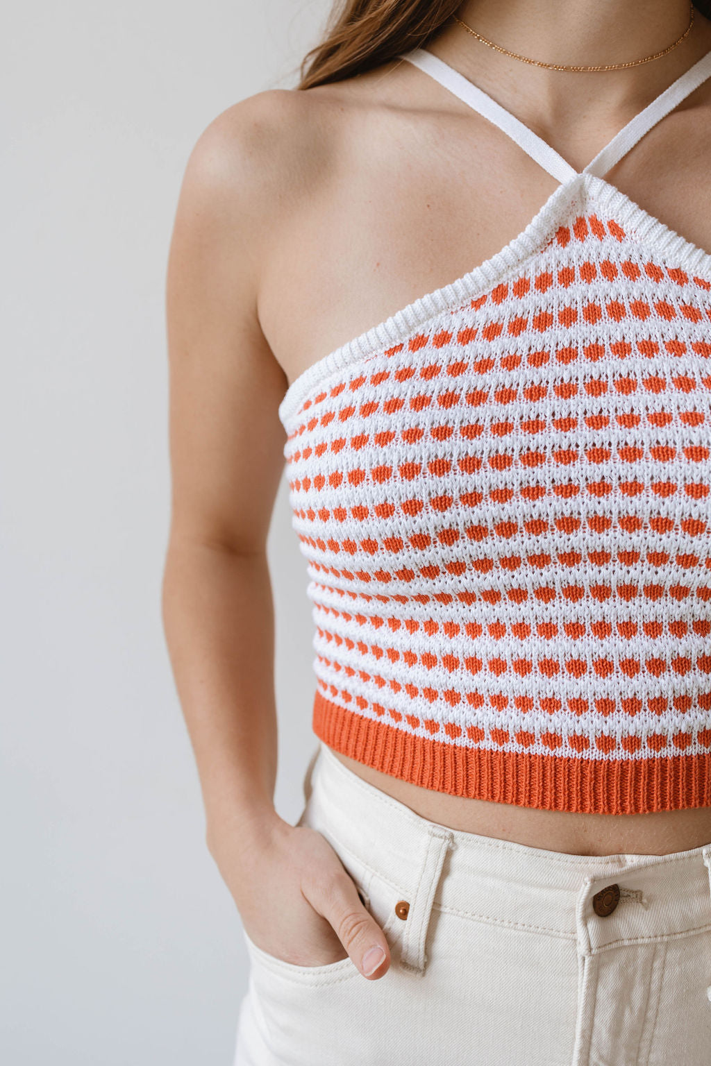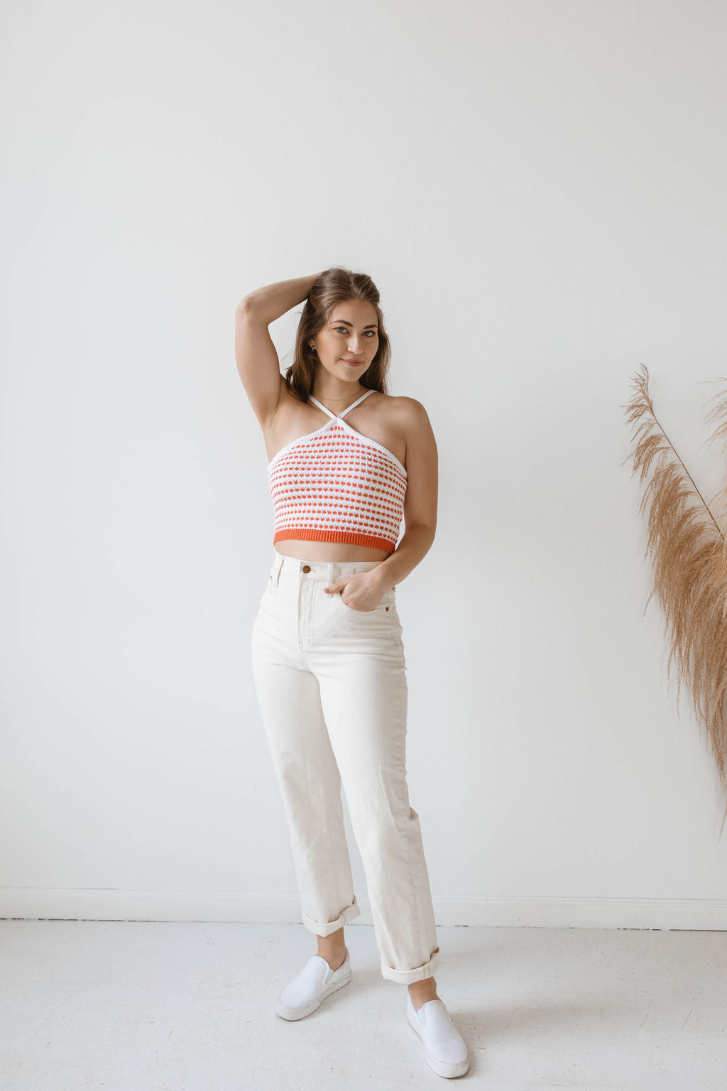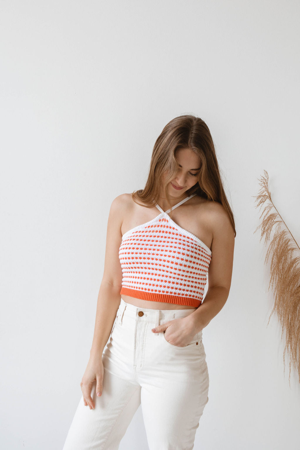 Nothing is cuter than our new Tangerine Top! This halter top is the bright pop of color your closet has been looking for. The super soft, knit fabric is stretchy and flattering on anyone and features adjustable straps. The gorgeous orange/white color pairs perfectly with blue jeans or white bottoms.